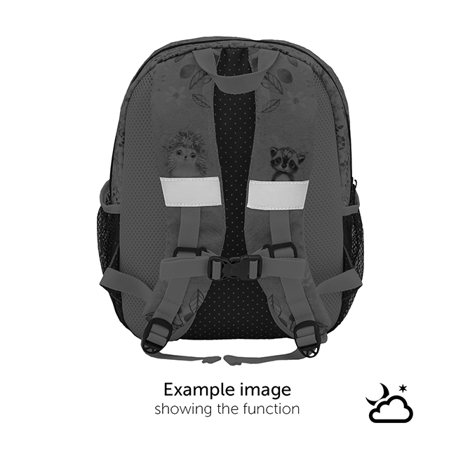 Odjeljak sa rajsferšlusom nudi dovoljno mesta za igračke, ćebence i lične stvari. Za unutrašnji deo ranca nasliksn je adresar za lične podatke (ime, adresa, broj telefona roditelja). Prednji džep je idealan za pernice ili za užinu, a bočni džepovi za bocu sa vodom ili za kišobran.